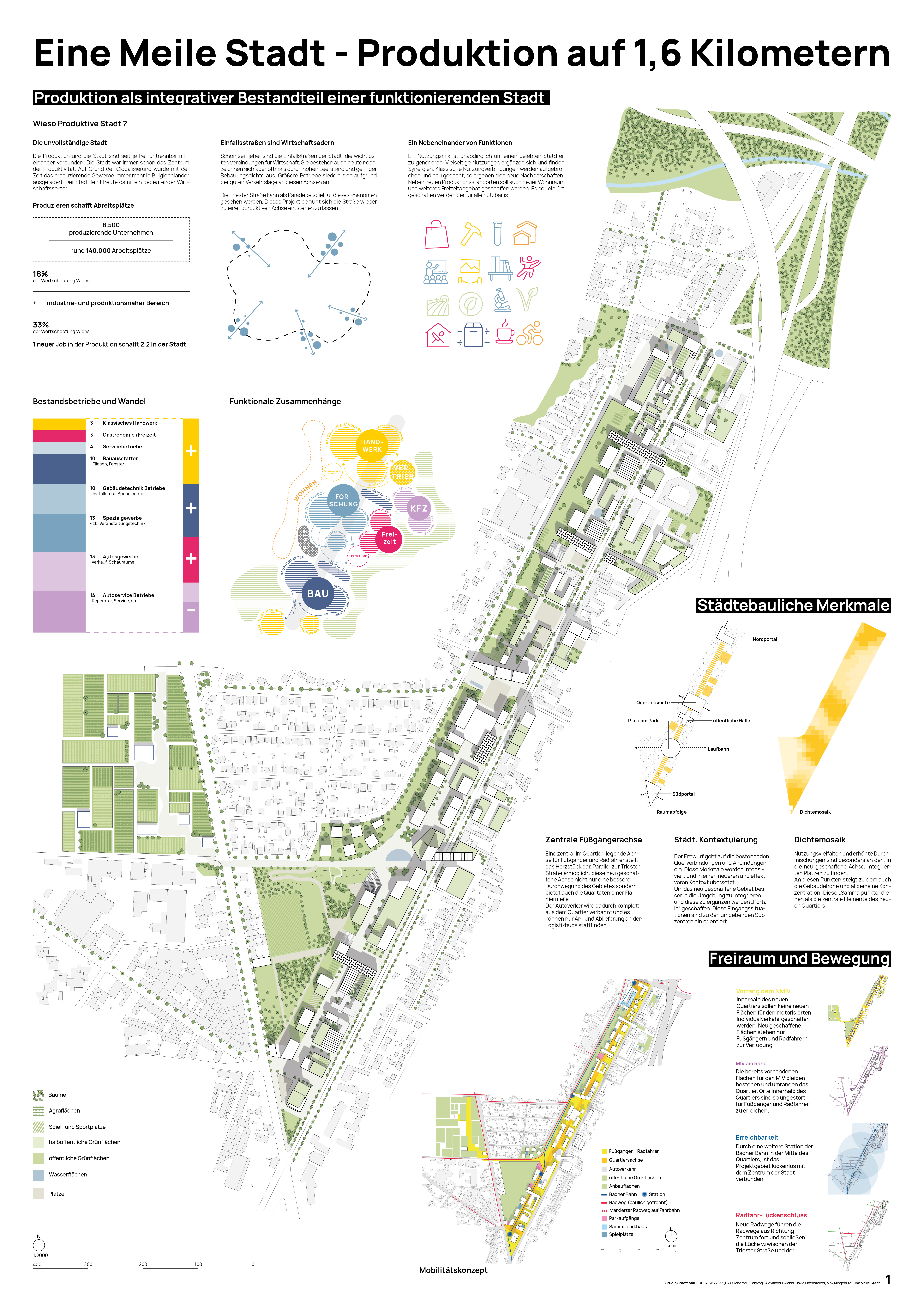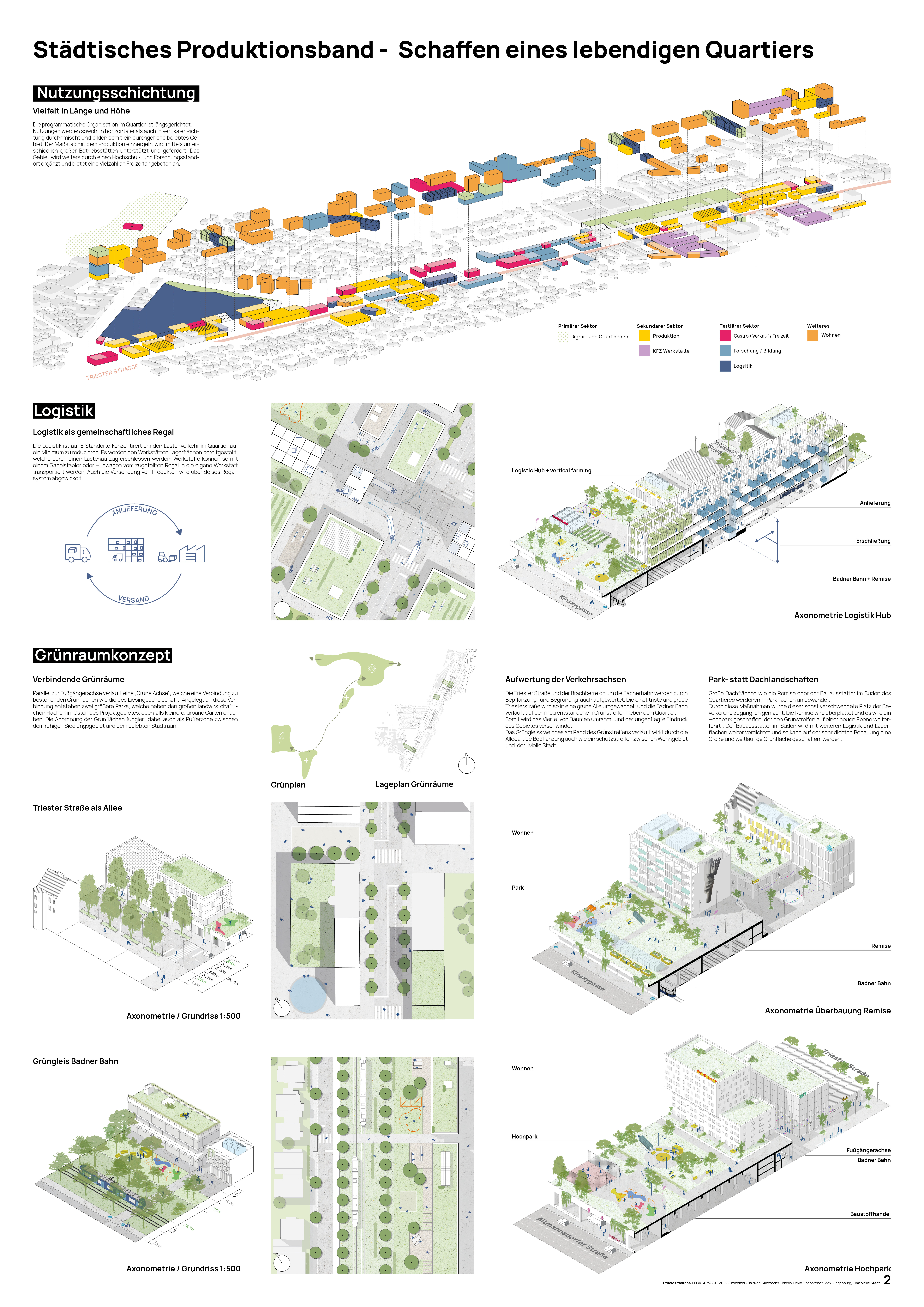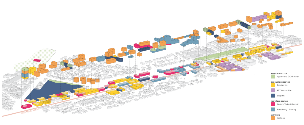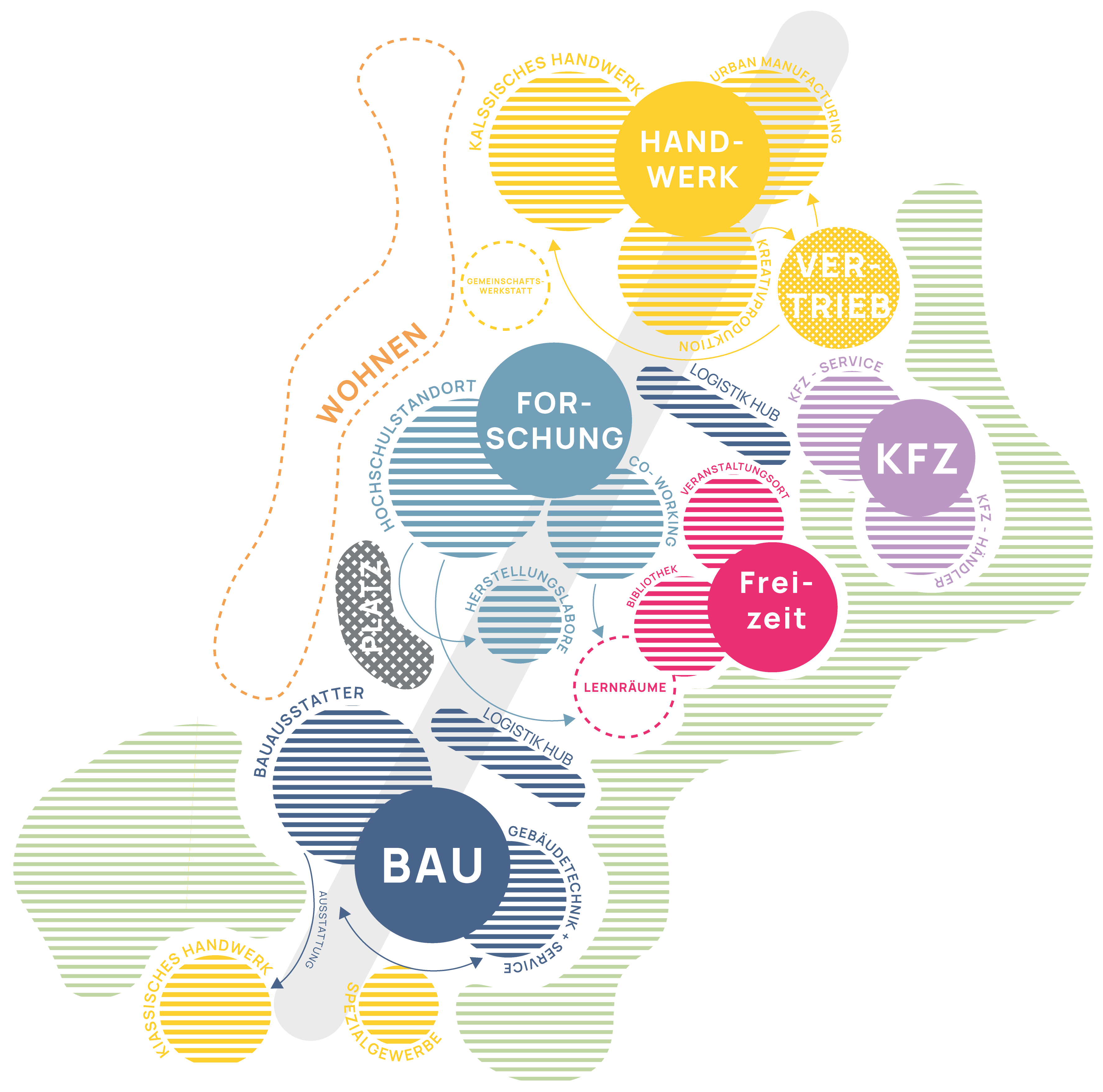 Ein Nutzungsmix ist unabdinglich um einen belebten Statdteil zu generieren. Vielseitige Nutzungen ergänzen sich und finden Synergien. Klassische Nutzungverbindungen werden aufgebrochen und neu gedacht, so ergeben sich neue Nachbarschaften. Neben neuen Produktionsstandorten soll auch neuer Wohnraum und weiteres Freizeitangebot geschaffen werden. Es soll ein Ort geschaffen werden der für alle nutzbar ist.