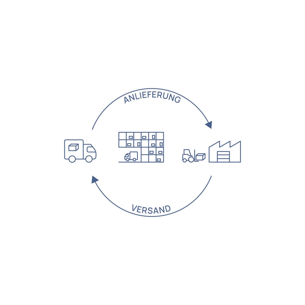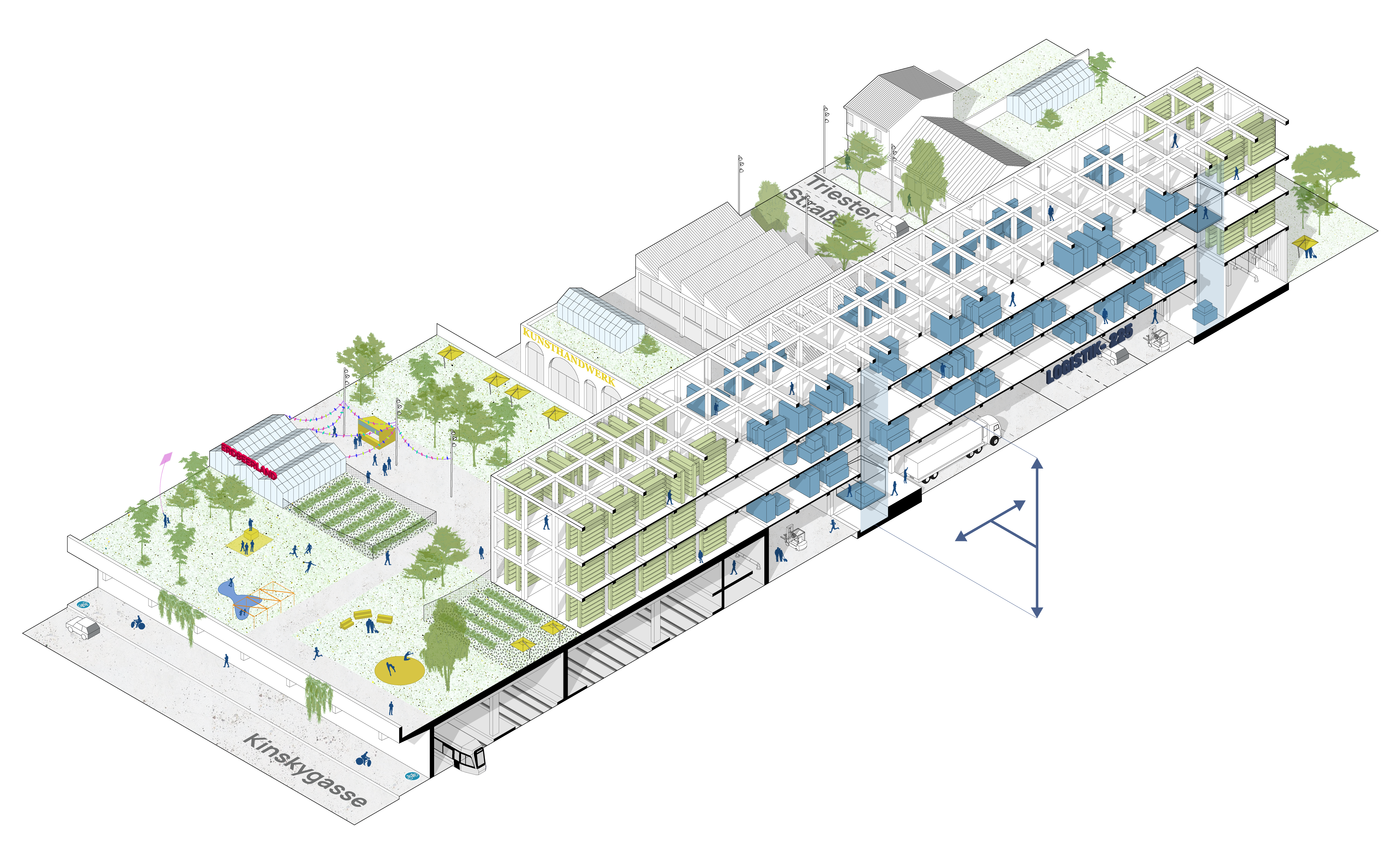 Die Logistik ist auf 5 Standorte konzentirert um den Lastenverkehr im Quartier auf ein Minimum zu reduzieren. Es werden den Werkstätten Lagerflächen bereitgestellt, welche durch einen Lastenaufzug erschlossen werden. Werkstoffe können so mit einem Gabelstapler oder Hubwagen vom zugeteilten Regal in die eigene Werkstatt transportiert werden. Auch die Versendung von Produkten wird über deises Regalsystem abgewickelt.