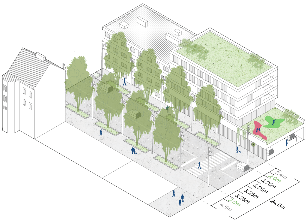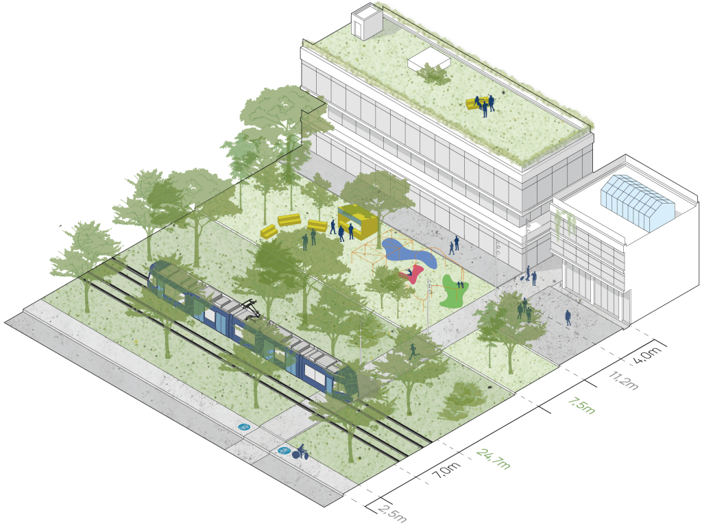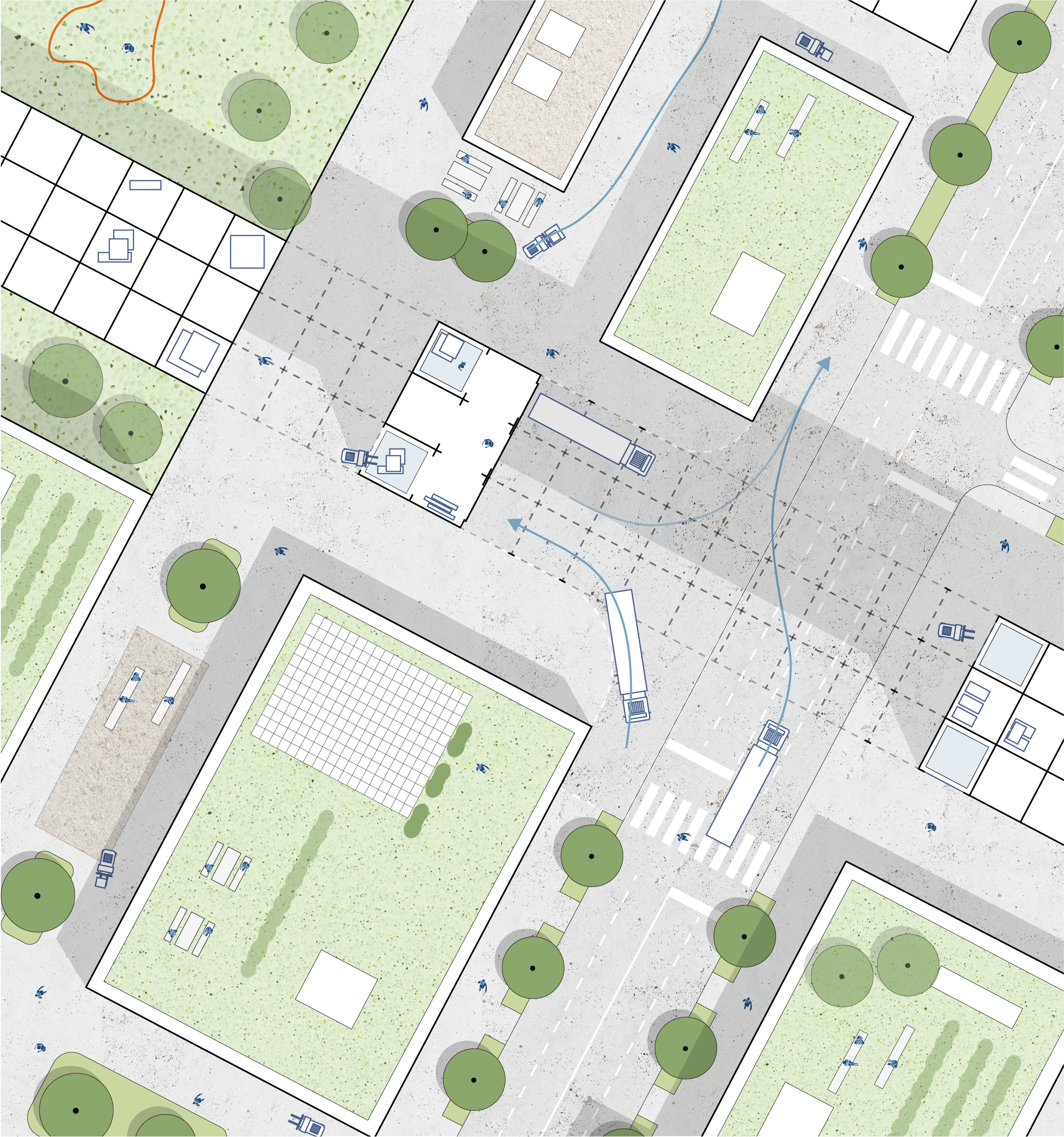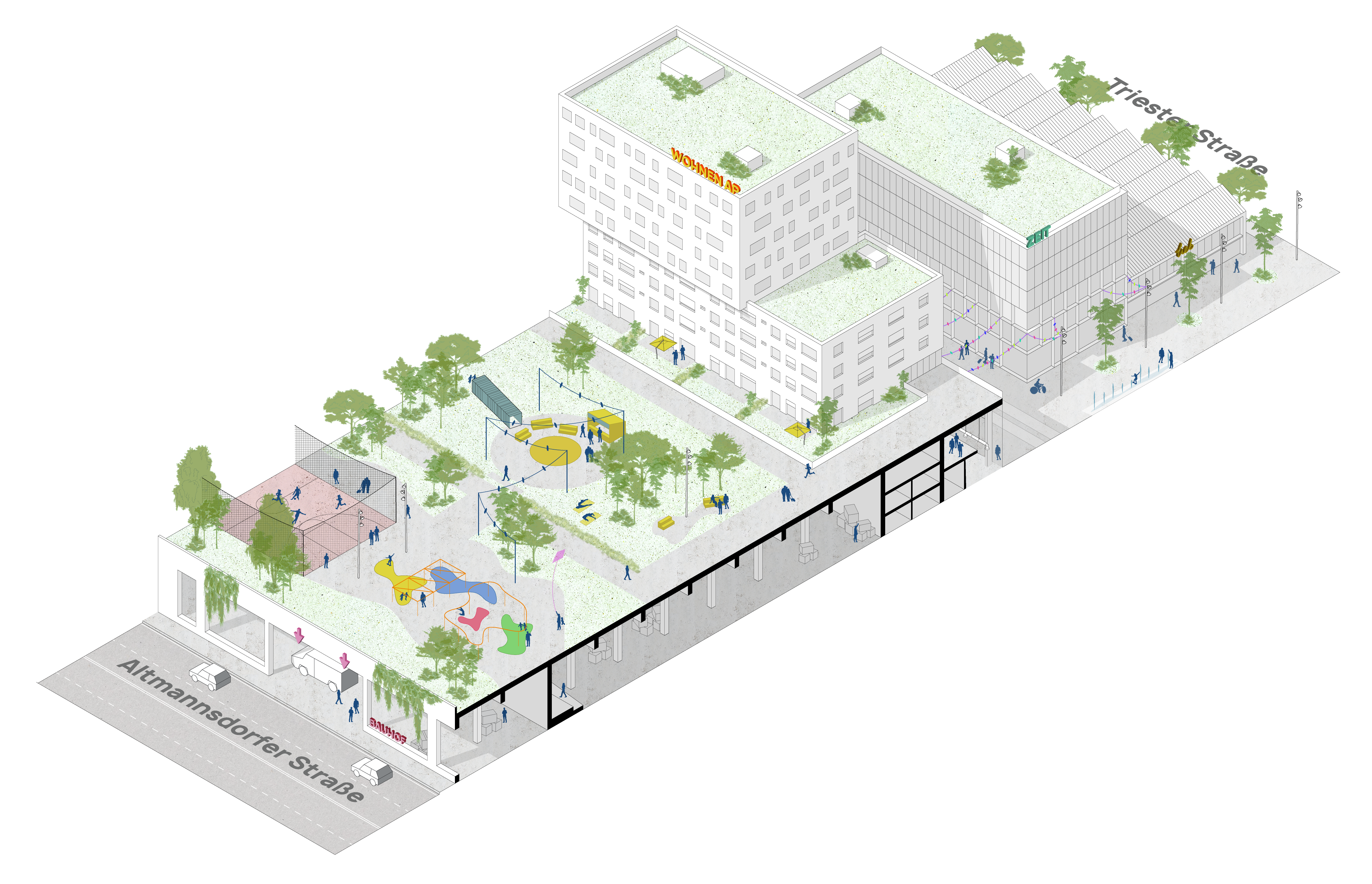 Eine zentral im Quartier liegende Achse für Fußgänger und Radfahrer stellt das Herzstück dar. Parallel zur Triester Straße ermöglicht diese neu geschaffene Achse nicht nur eine bessere Durchwegung des Gebietes, sondern bietet auch die Qualitäten einer Flaniermeile.