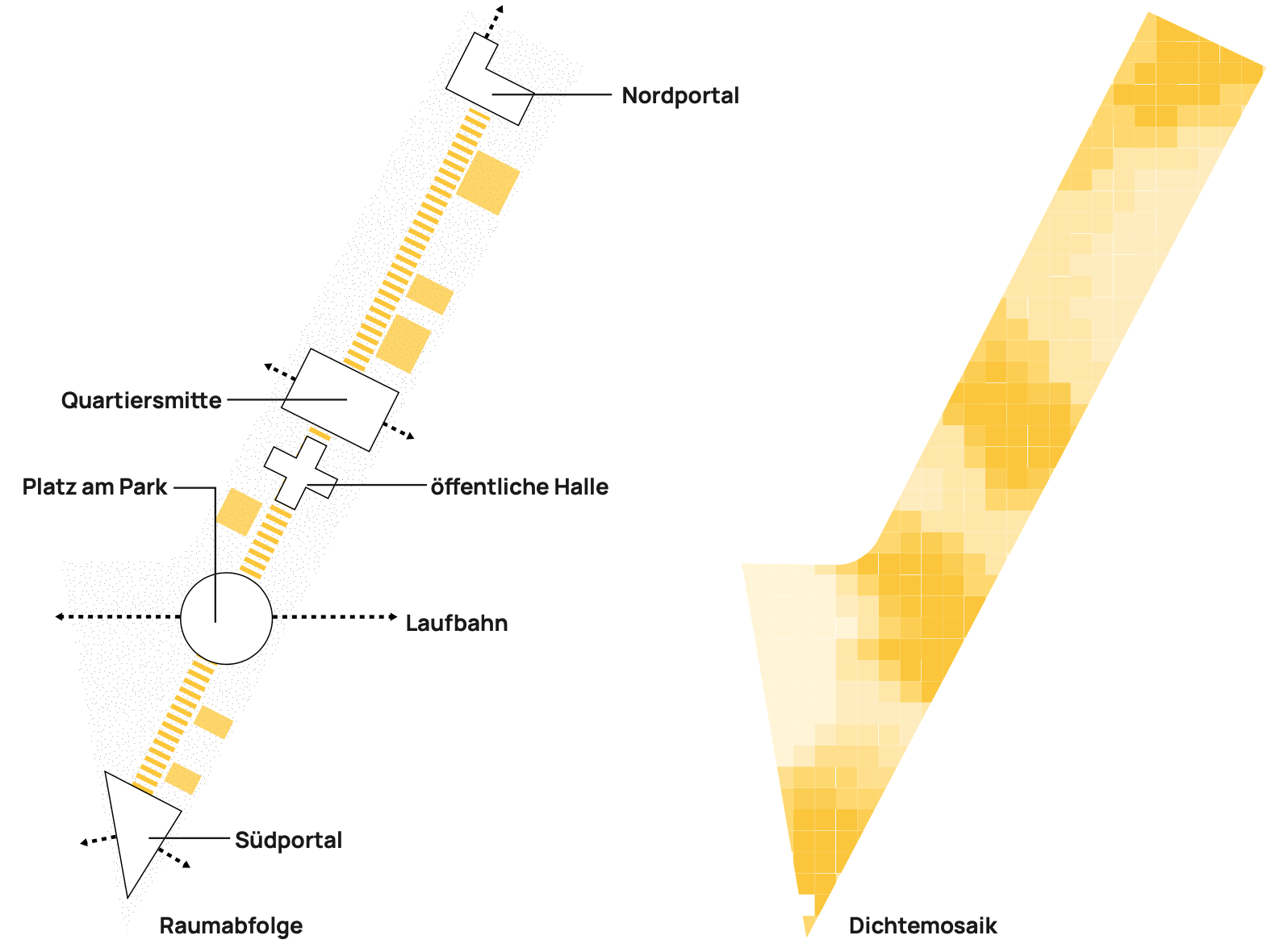 Um das neu geschaffene Gebiet besser in die Umgebung zu integrieren und diese zu ergänzen werden „Portale“ geschaffen. Diese Eingangssitua- tionen sind zu den umgebenden Subzentren hin orientiert.