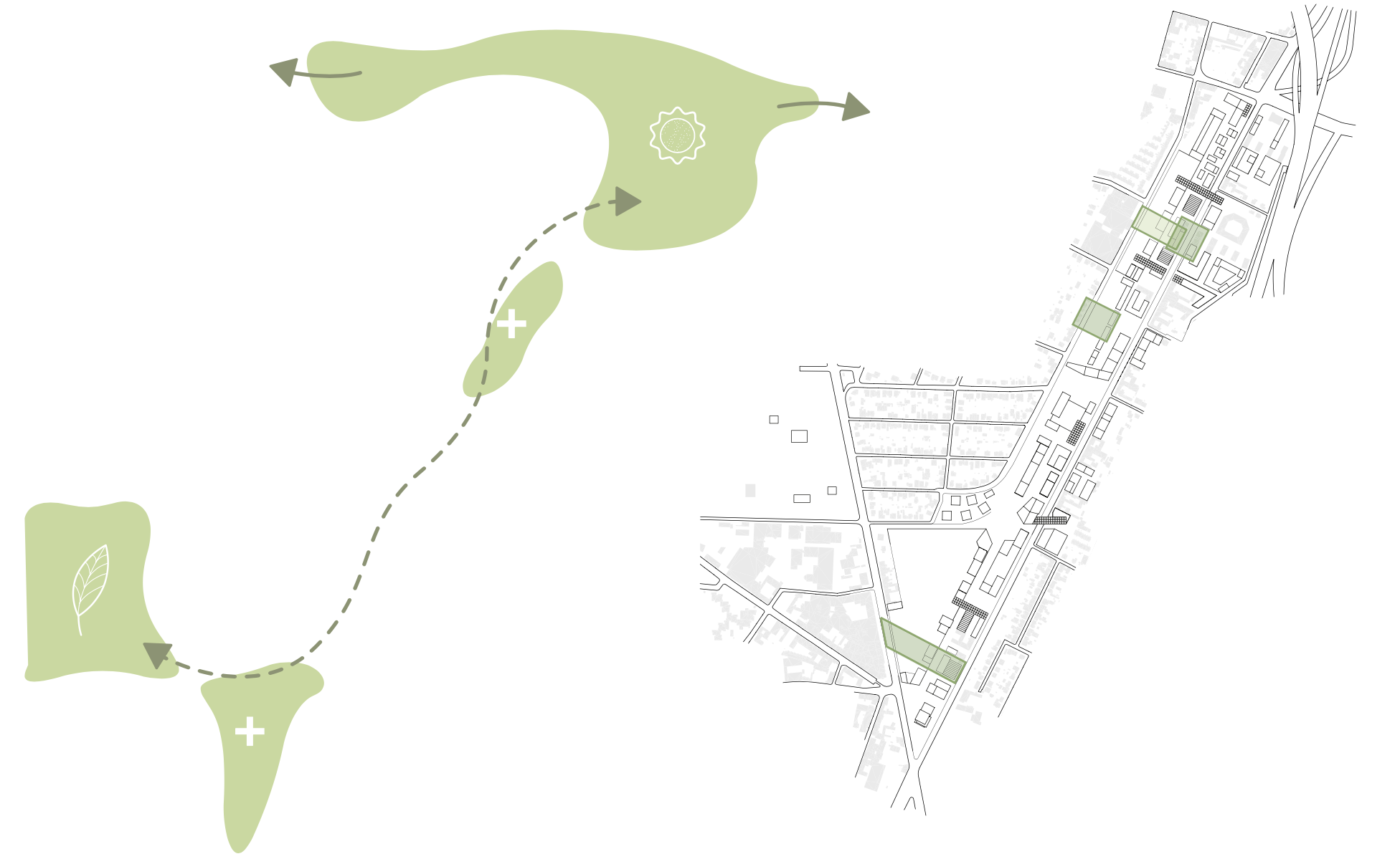 Parallel zur Fußgängerachse verläuft eine „Grüne Achse“, welche eine Verbindung zu bestehenden Grünflächen wie die des Liesingbachs schafft. Angelegt an diese Verbindung entstehen zwei größere Parks, welche neben den großen landwirtschaftlichen Flächen im Osten des Projektgebietes, ebenfalls kleinere, urbane Gärten erlauben. Die Anordnung der Grünflächen fungiert dabei auch als Pufferzone zwischen dem ruhigen Siedlungsgebiet und dem belebten Stadtraum.