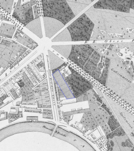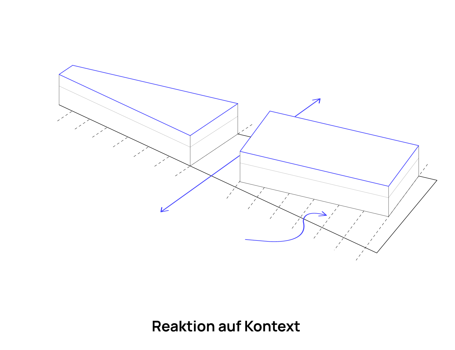 die markante dreieckige Form des Bauplatzes ergab sich durch die Überlagerung verschiedenster Zeitschichten an einem Ort. 1830 war er noch als großer Gemüsegarten genutzt worden. Die 1858 errichtete Verbindungsbahn schnitt den Garten in zwei Teile, welche durch den Siedlungsdruck in der Gründerzeit als Bauland genutzt wurden. In dieser Form ist der Bauplatz bis heute erhalten geblieben.